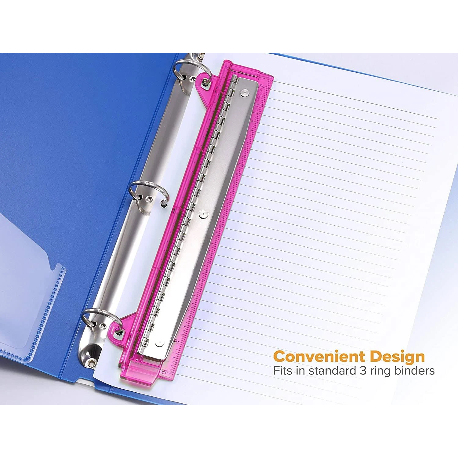 This efficient, compact three-hole punch is great for travel or for storing in three-ring binders. The precision steel punch heads slice through up to five sheets, while the integrated ruler and built-in paper guide ensures accuracy each time.