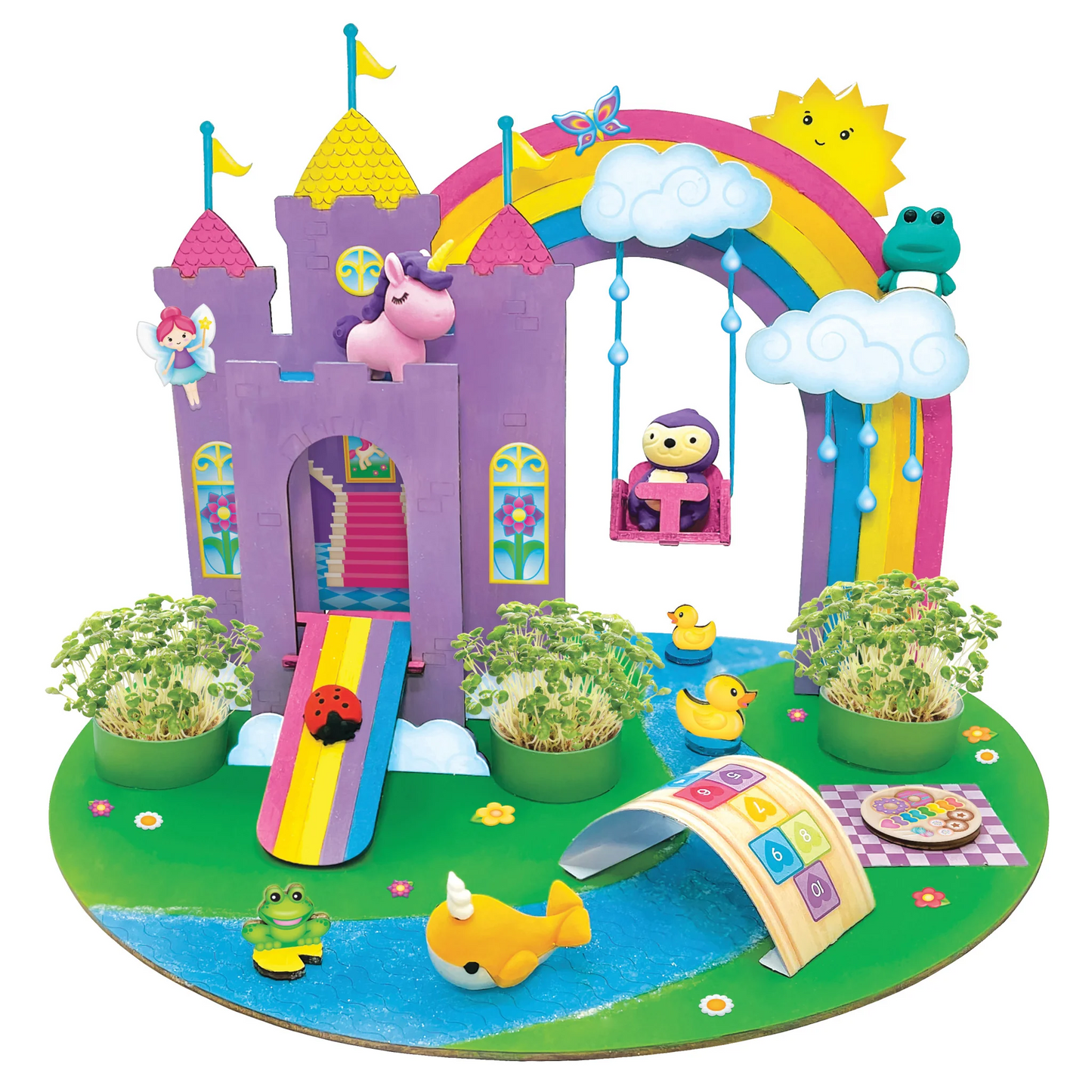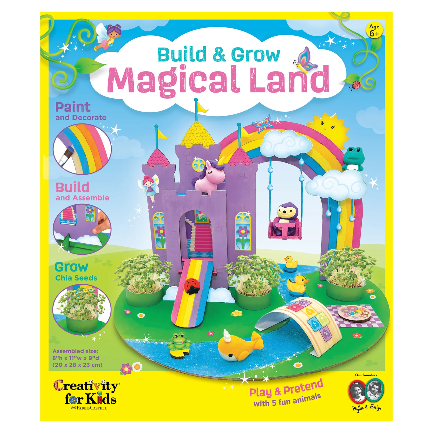This multi-craft kit provides a fun, educational experience for children as they paint, build and grow their own enchanted castle and magical playland. The pre-cut wooden playland and accessories come ready to paint, decorate and assemble. Step-by-step instructions are colorful and easy to follow, allowing children to work independently, together as a family craft or in a group activity. Fast-growing chia seeds and soil-free grow mats make for less mess and more fun for budding gardeners as they landscape their magical land. The low maintenance chia seeds are grown in the USA and should sprout in as little as 3 to 5 days! Kids will continue to enjoy this activity as they play and pretend, long after craft time is done.