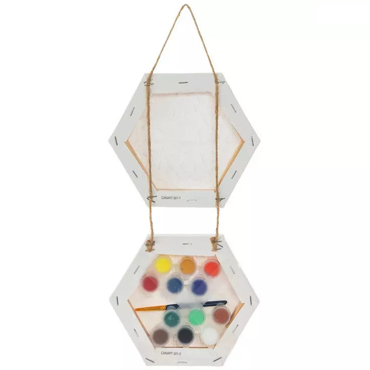 Includes: 2 hexagonal preprinted canvases, 12 acrylic paint pots and 2 brushes