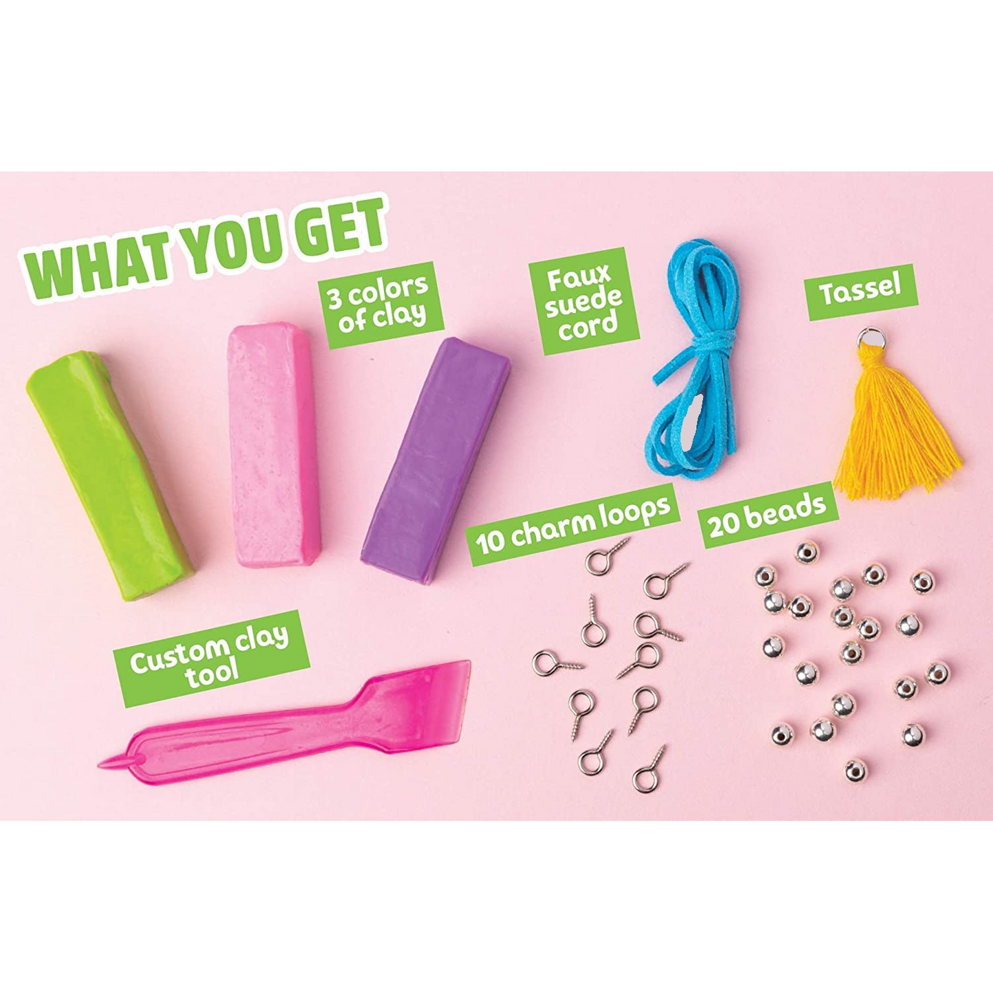 Includes: 24 page book of instructions and inspiration, 3 colors of clay, tassel, custom clay tool, 10 charm loops, 20 beads, faux suede cord