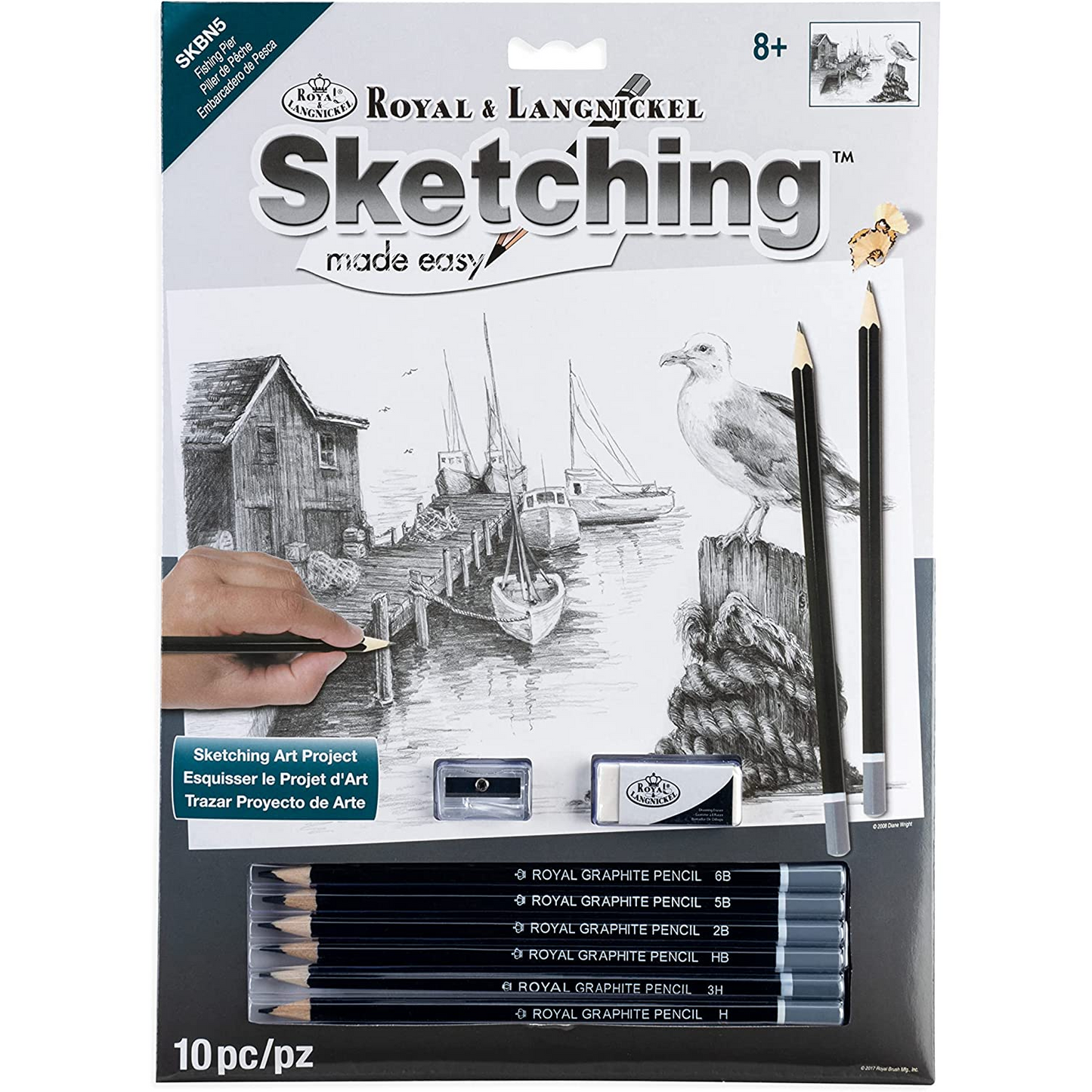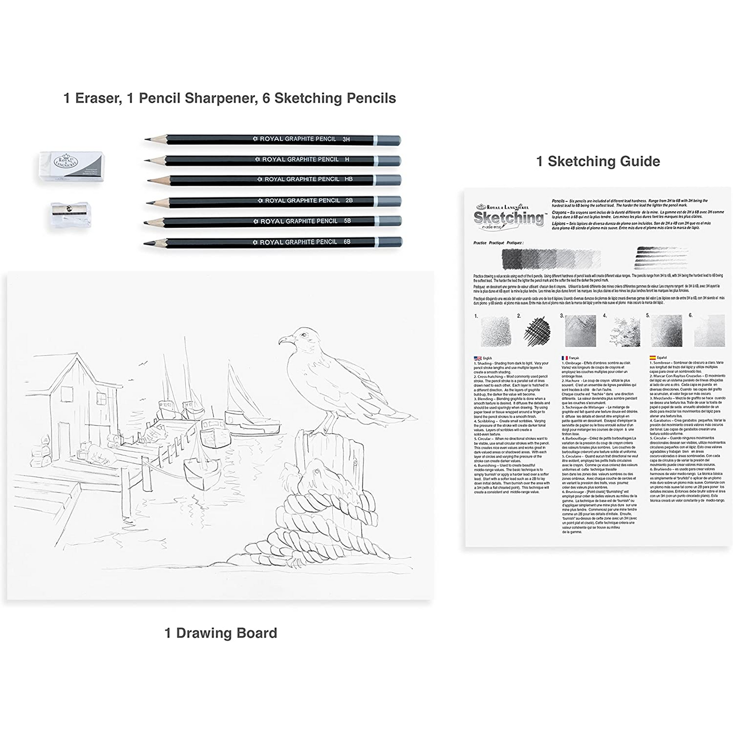 Includes: a very lightly pre-printed 11-3/8" x 8-3/4" board, six graphite pencils (3H, H, HB, 2B, 5B and 6B), eraser, sharpener and basic sketching instructions