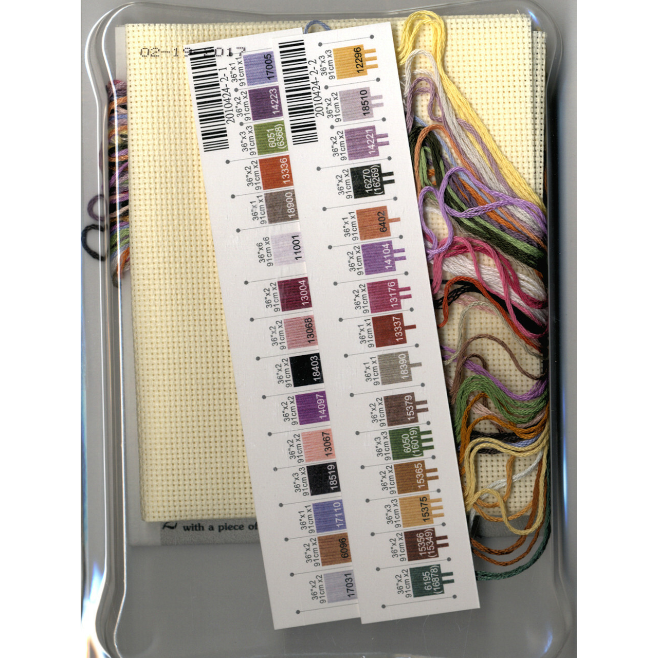 Includes: ivory 18 count Aida x-stitch fabric, color-coded thread cards with pre-sorted 100% cotton embroidery floss, needle, chart and easy to follow instructions