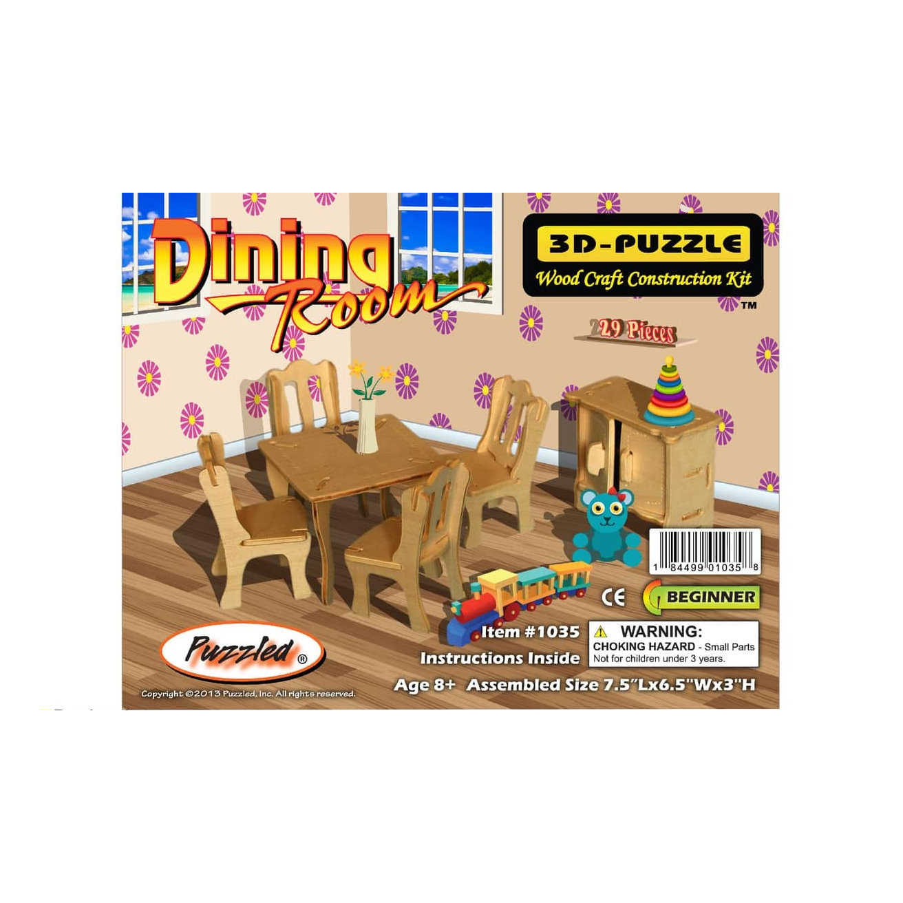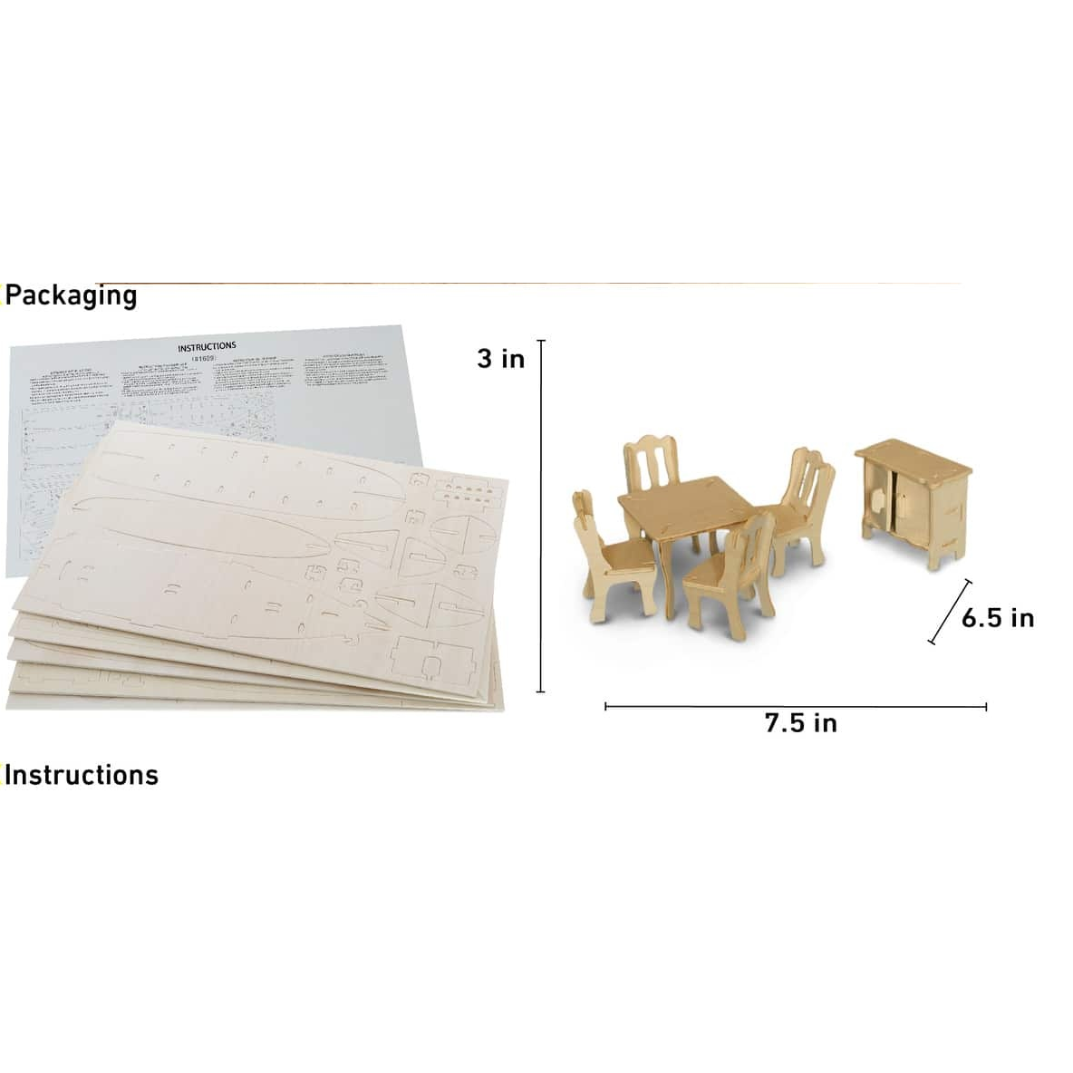 This dining room 3D puzzle features authentic intricate details like dining table, chairs & small cabinet that result in a realistic-looking model kit No need to use glue! All pieces are interlocking & will remain sturdy once the puzzle is perfectly assembled. Once it has been fully assembled, the furniture pieces will stand upright. If you want the wood can be painted or colored for a more personalized and realistic look.