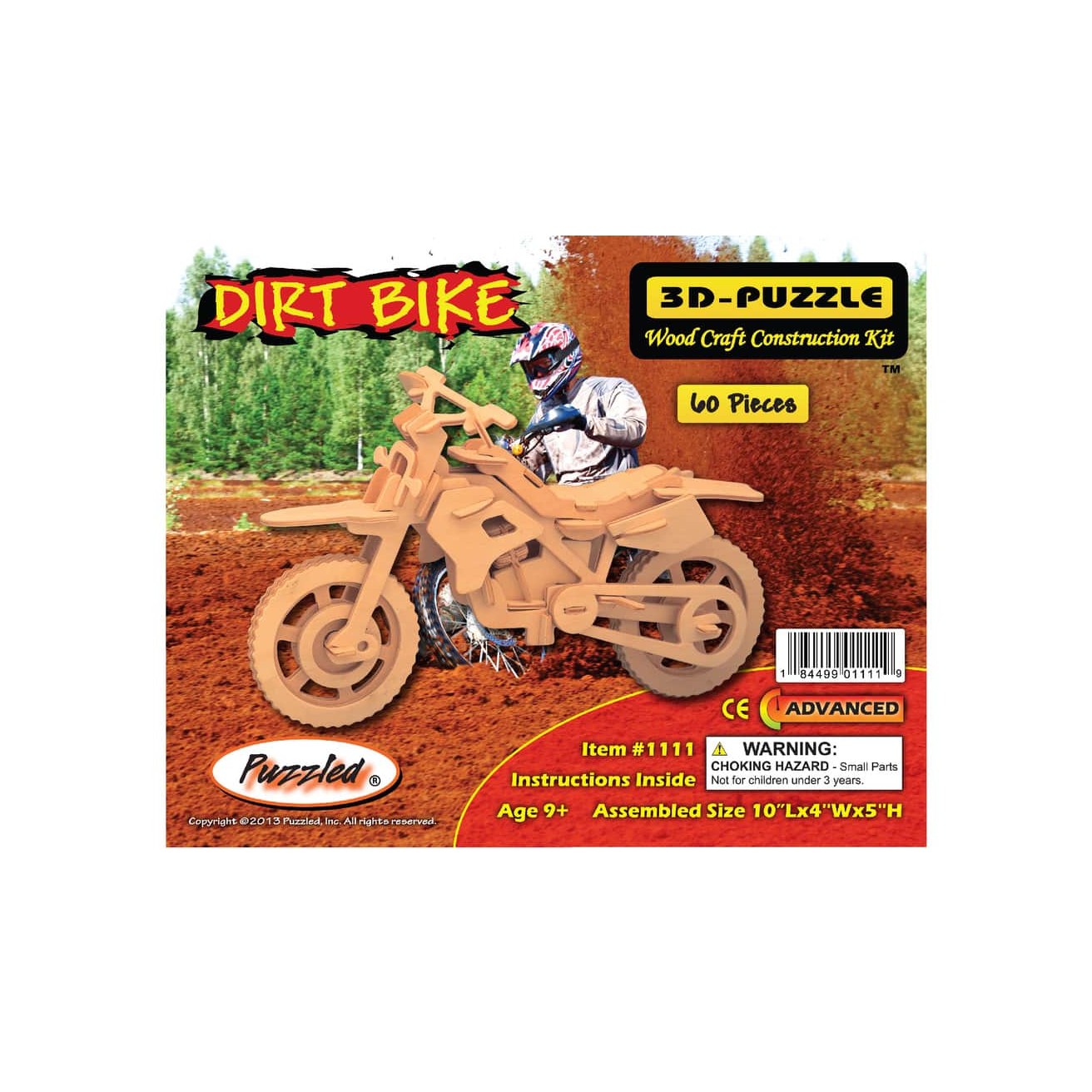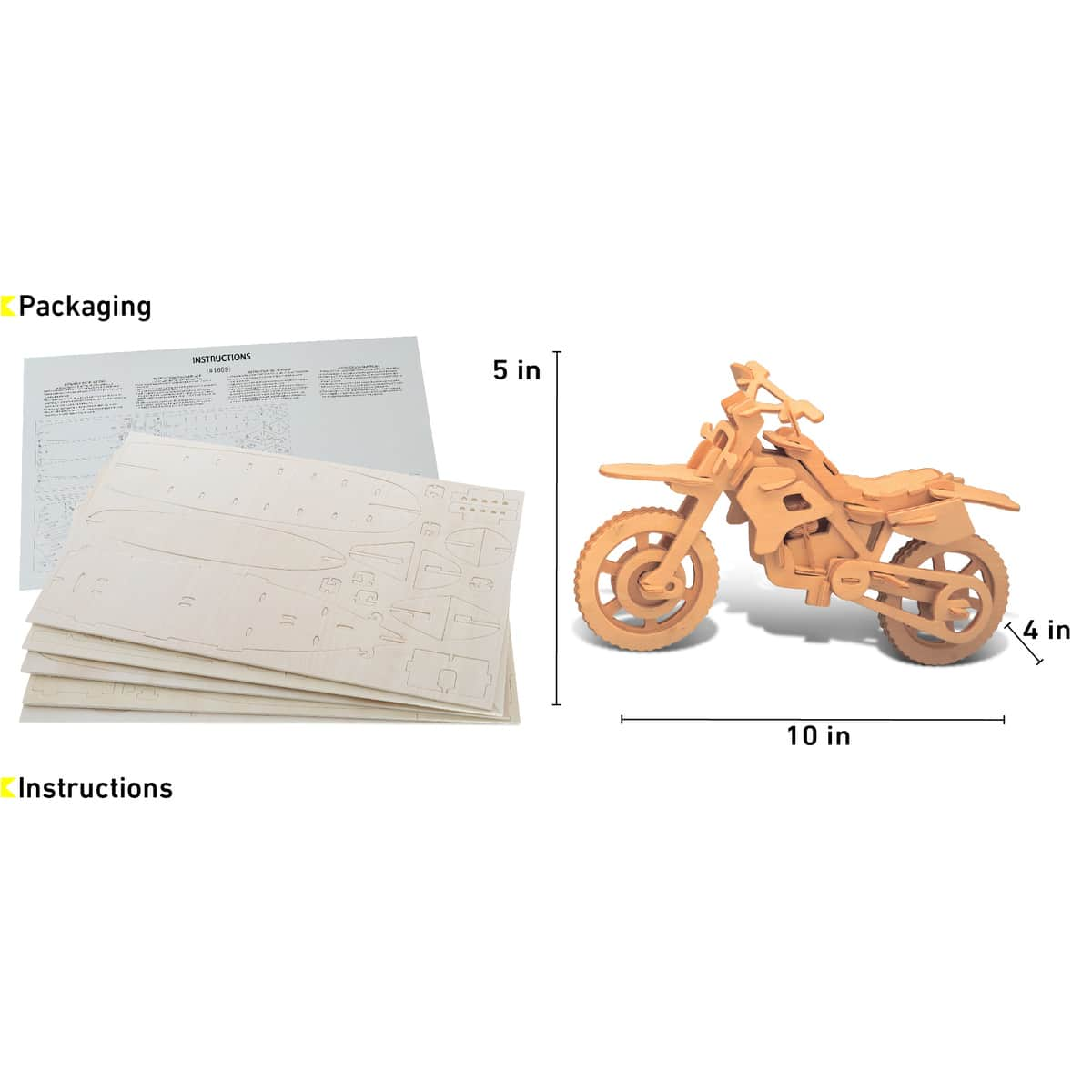 This dirt bike 3D puzzle features intricate and realistic details such as intricate and realistic details such as driving wheels, handlebars, engine, and gas tank.  No need to use glue! All pieces are interlocking & will remain sturdy once the puzzle is perfectly assembled. Once it has been fully assembled, the dirt bike will stand upright.  If you want the wood can be painted or colored for a more personalized and realistic look.