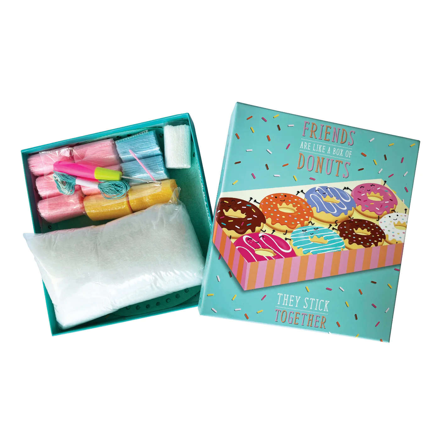 Includes: color-coded latch hook canvas, felt mat, crafting needle, latch hook tool, cotton stuffing, 10 rolls of pre-cut yarn and instructions