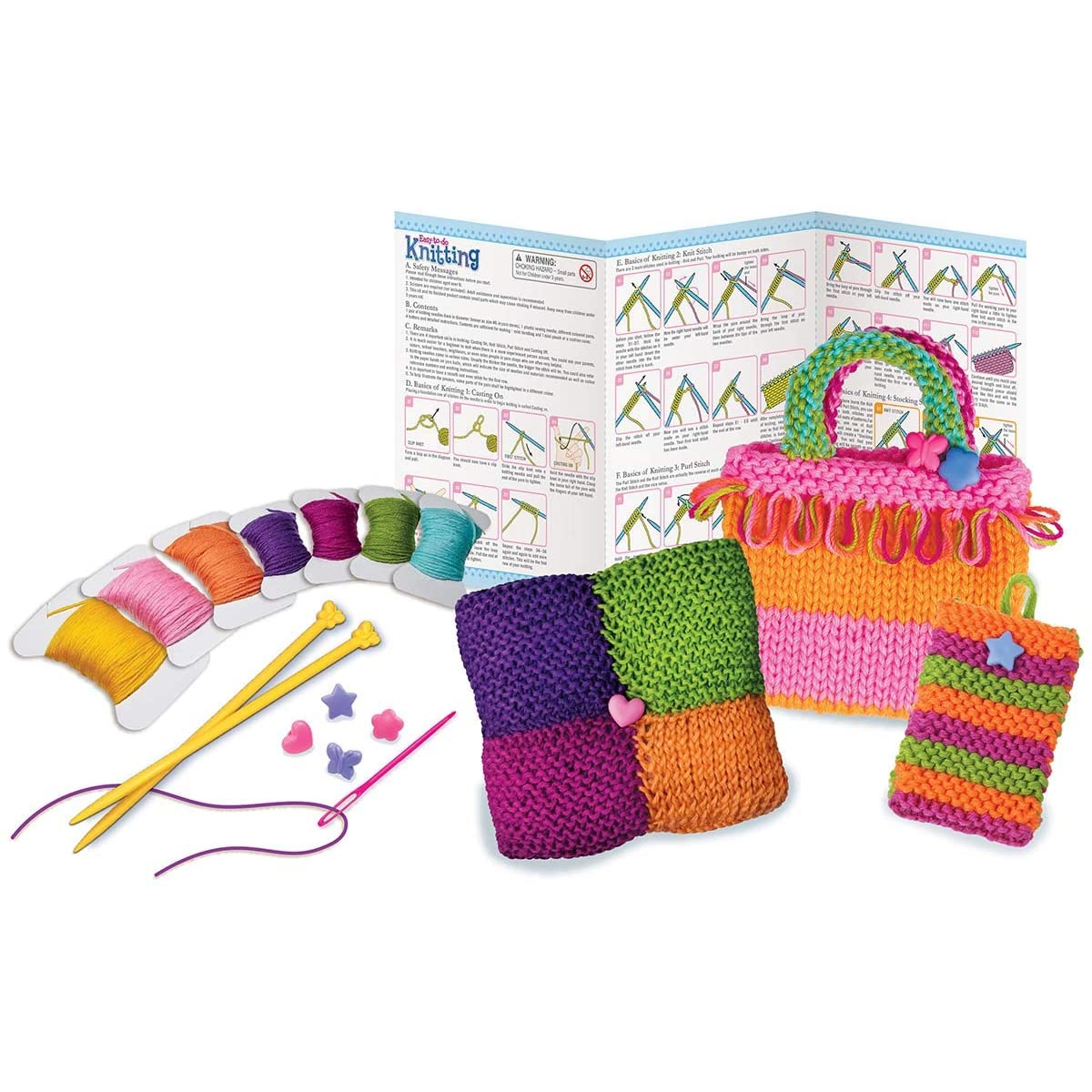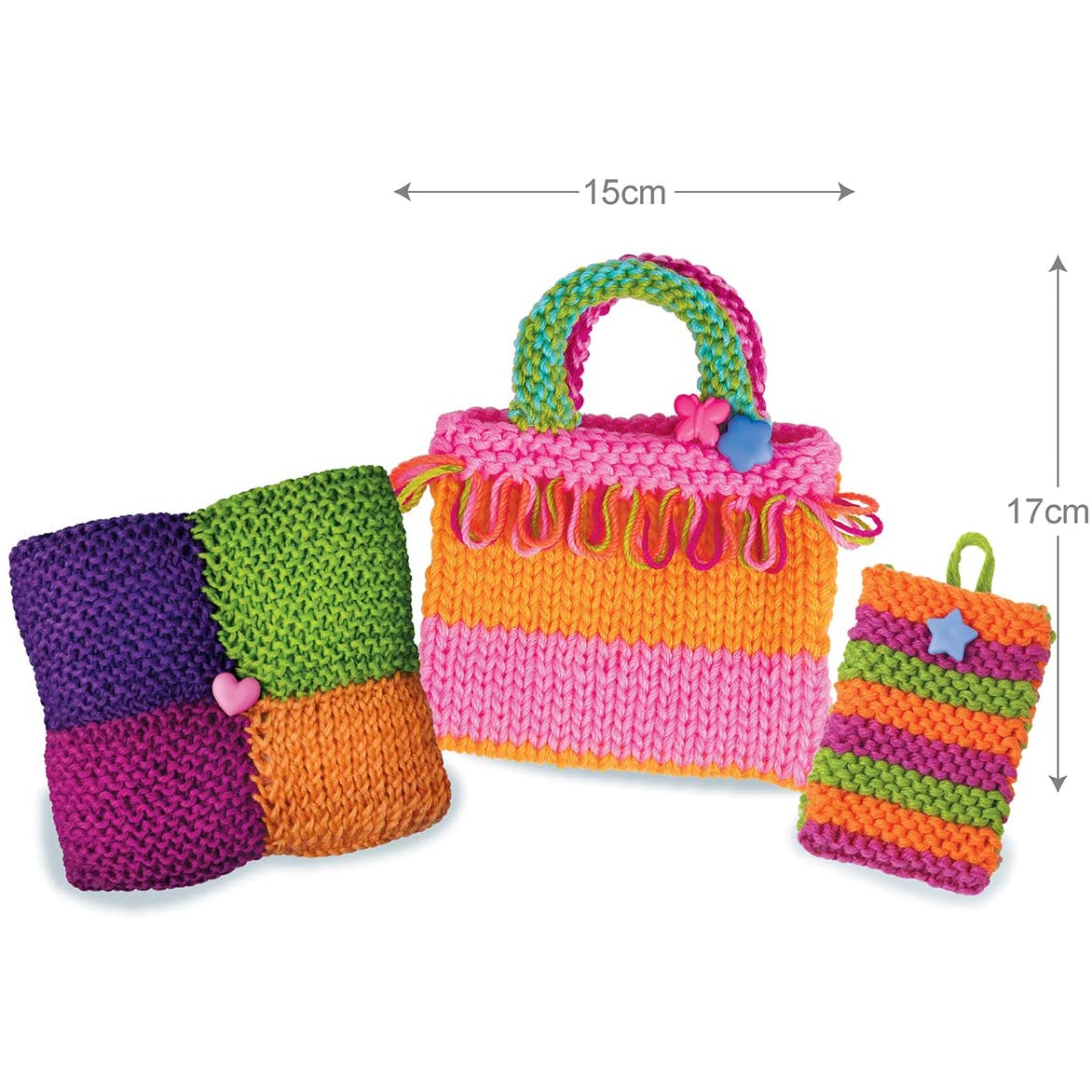 Includes: plastic kitting needles, a detailed instruction manual, and enough yarn to make your own mini hand bag, pillow, and more