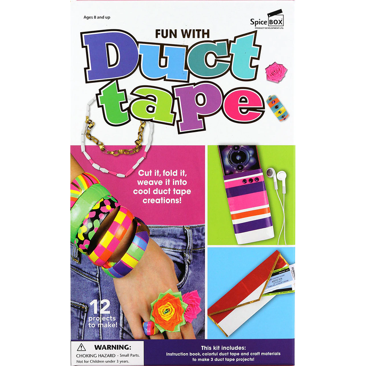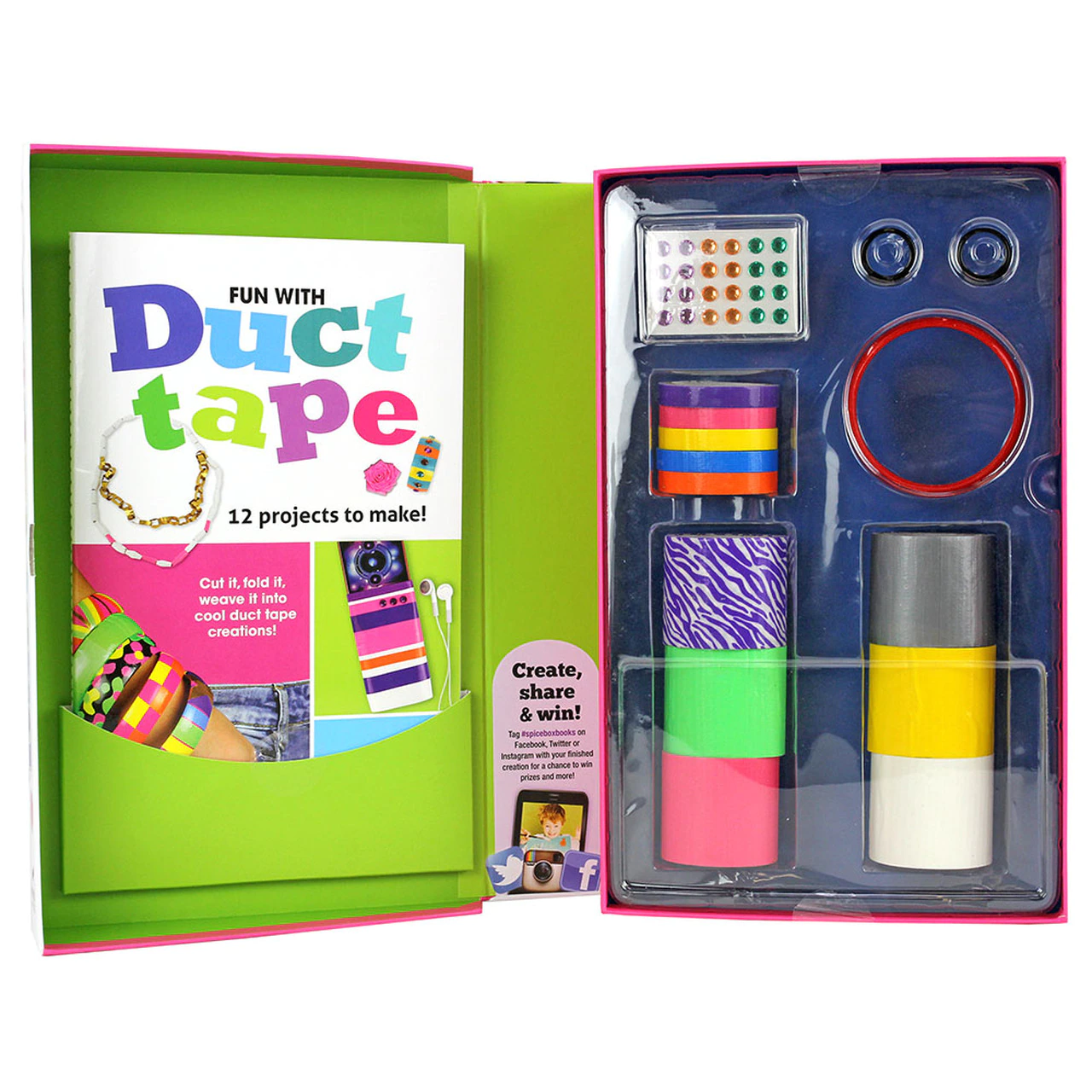 Includes:  5 rolls of narrow duct tape (assorted colors), 5 rolls of wide duct tape (assorted colors) ,1 plastic bangle, 24 craft gemstones, 2 plastic rings and  instruction book