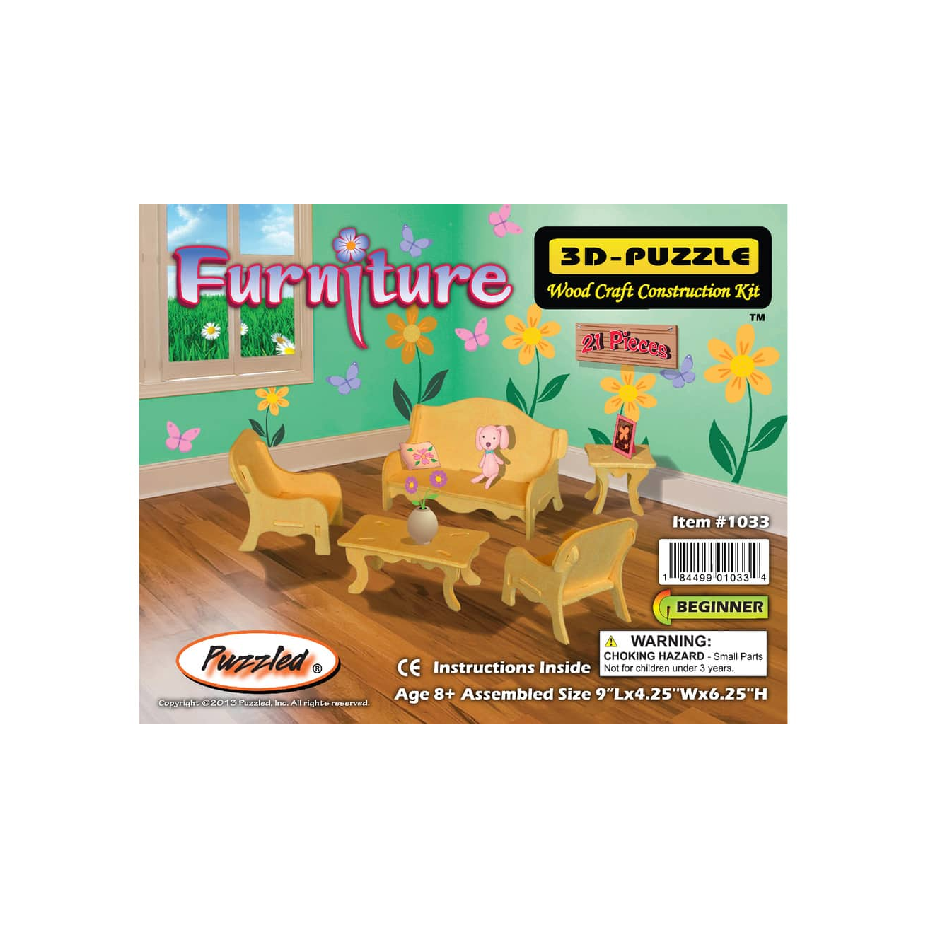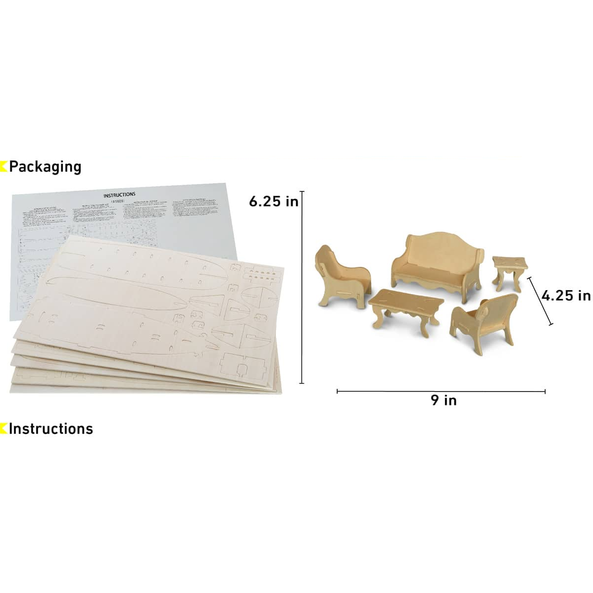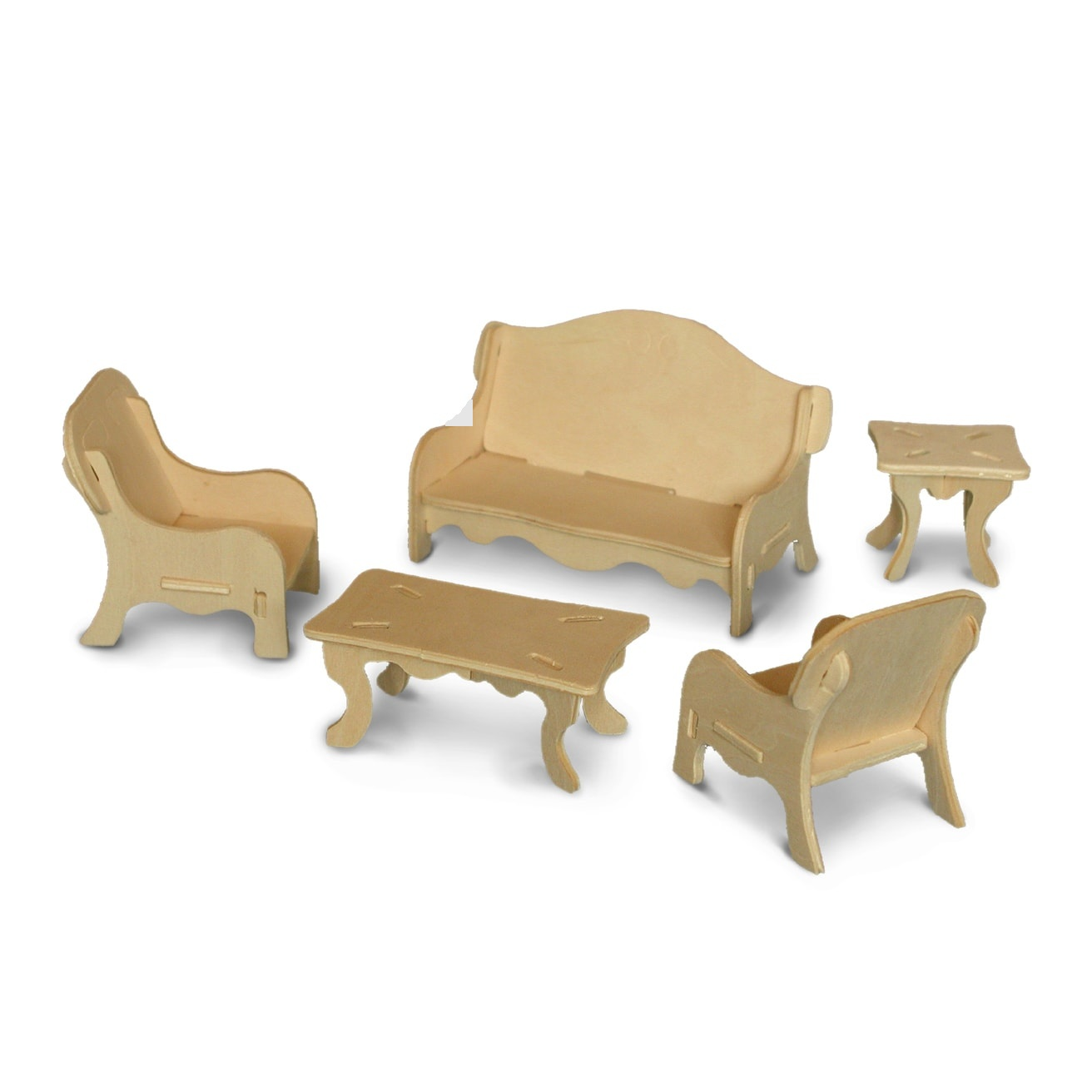 This furniture 3D puzzle features authentic intricate details like armchairs, couch, coffee table, and side table that result in a realistic model kit. No need to use glue! All pieces are interlocking & will remain sturdy once the puzzle is perfectly assembled. Once it has been fully assembled, the furniture pieces will stand upright.  If you want the wood can be painted or colored for a more personalized and realistic look.