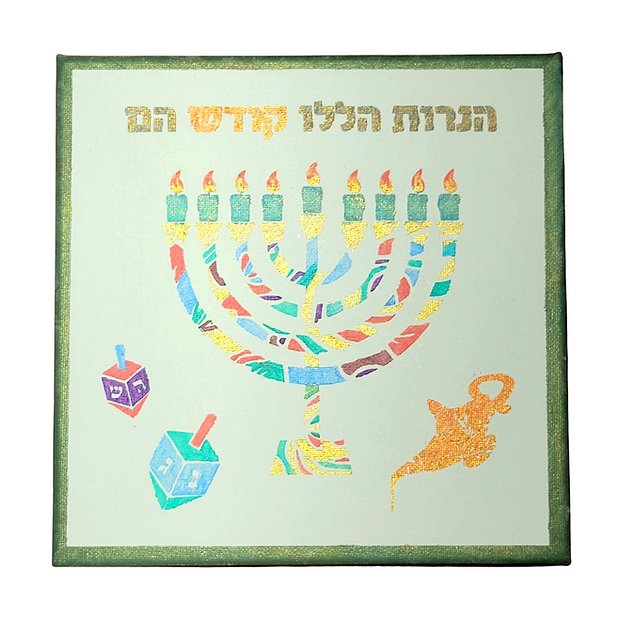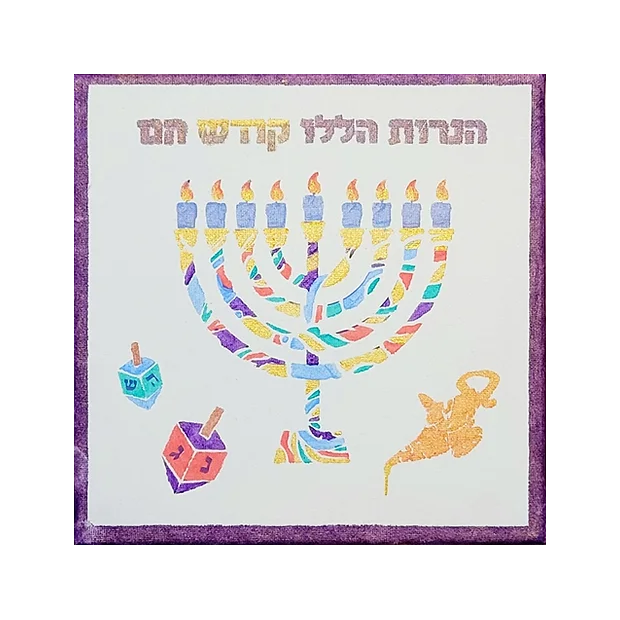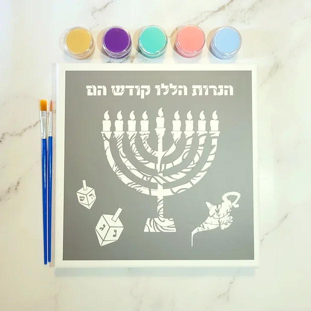 Includes: 8" x 8" canvas with Hanerot Halalu design, 5 colors acrylic paint, 2 paint brushes and color wheel brochure with instructions