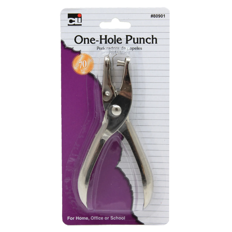 This single hole punch offers convenient hand held use with a hinged chip catcher. Great for home, office or school use. Punches 1/4" diameter holes.