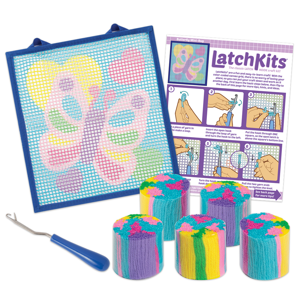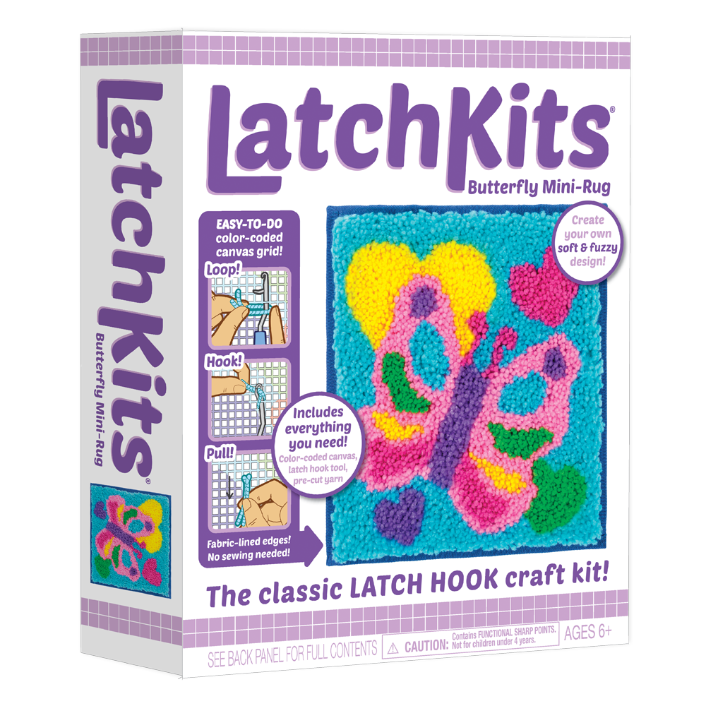 LatchKits are a fun and easy to learn craft-just loop, hook, and pull! The sturdy canvas features fabric-lined edges and hanging loops to create your very own soft and fuzzy design that’s ready to hang on your wall or use as a mini rug.