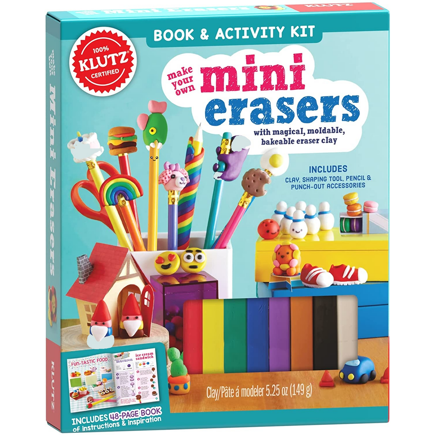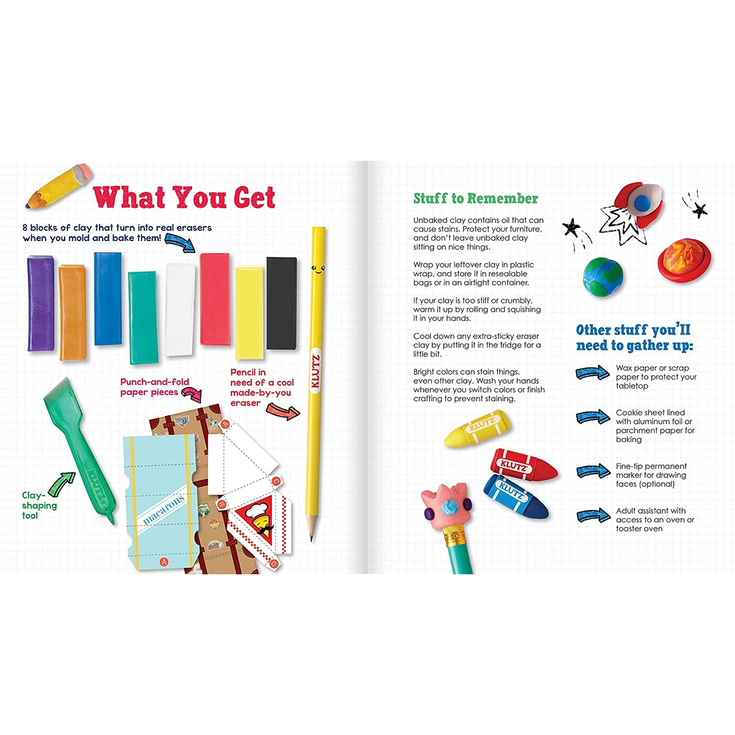 Includes: 48 page book of instructions and inspiration, 8 colors of eraser clay, pencil,