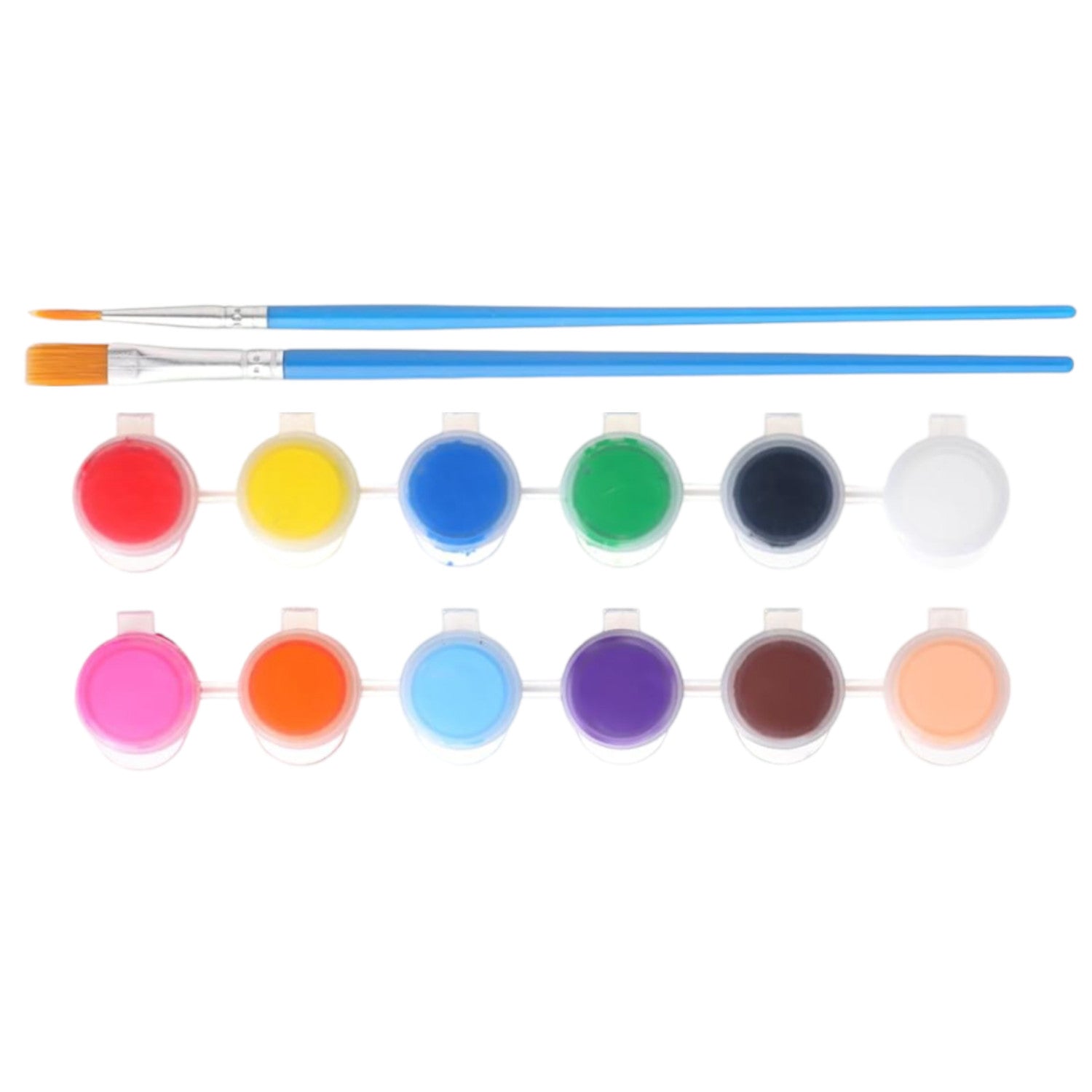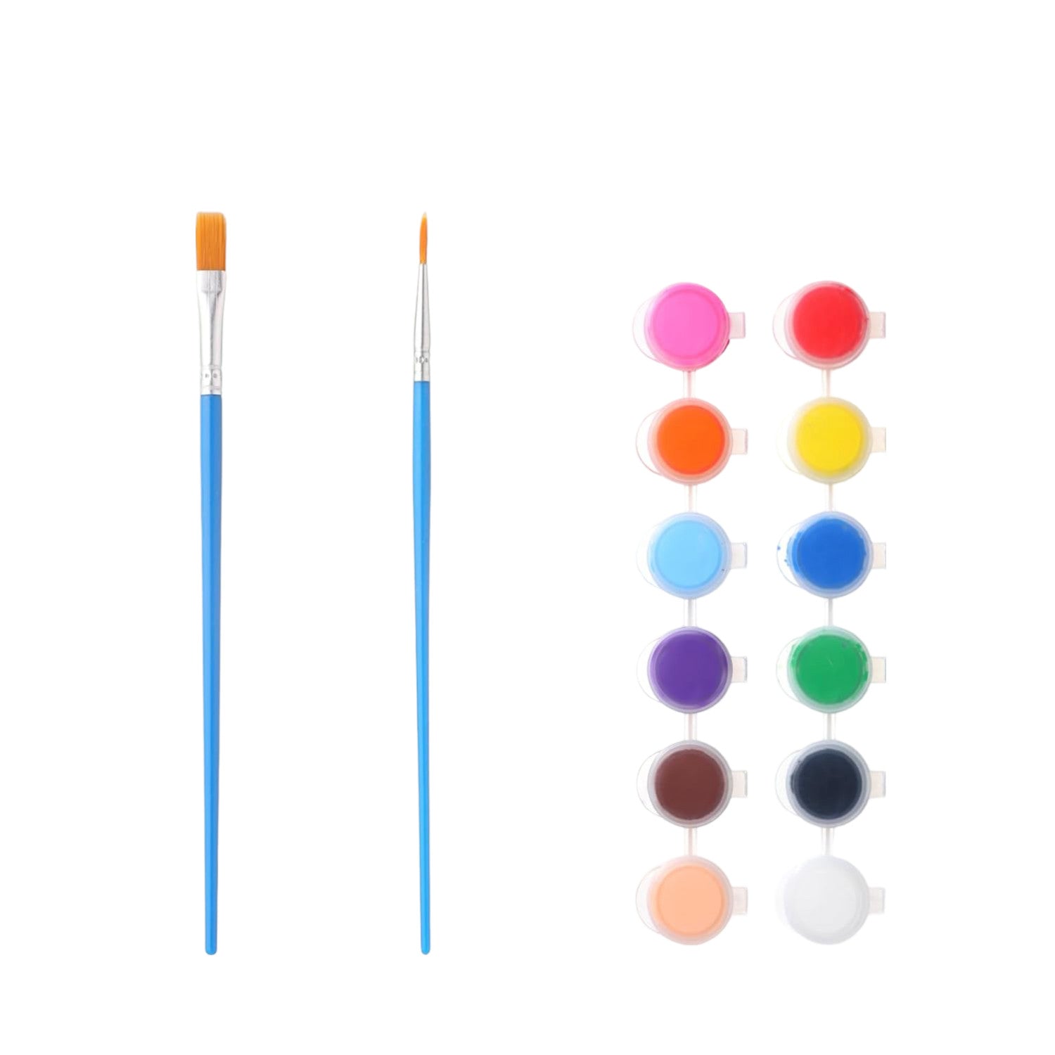 Includes: paint pots prefilled with acrylic paint in 12 colors, flat paint brush and pointed paint brush