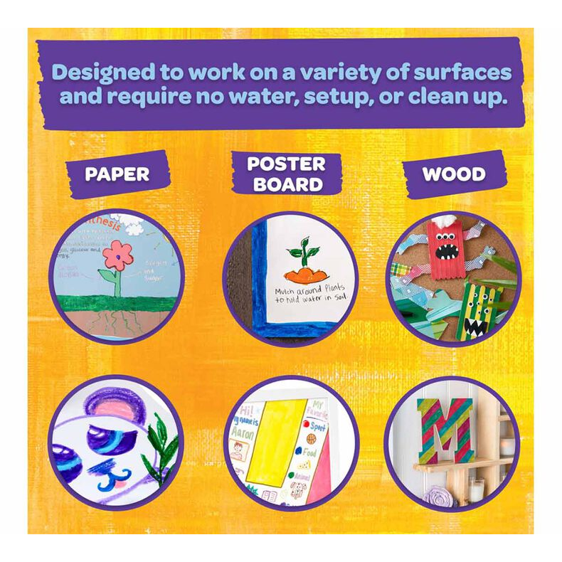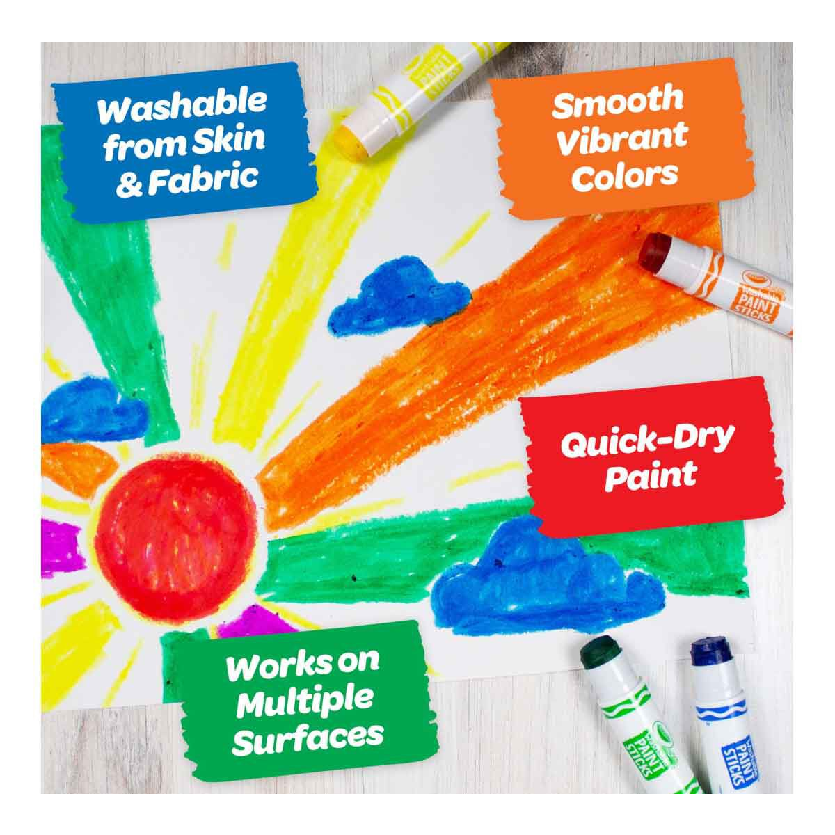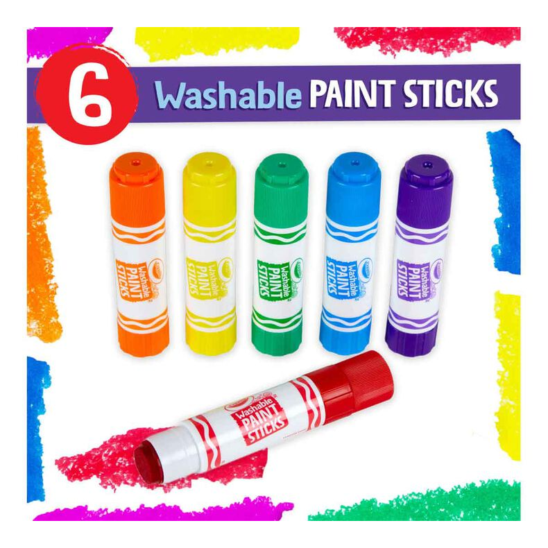 Paint Sticks allow you to have all the fun of paint without all the mess! No set up, clean up, or water is required and they easily wash clean from skin and most washable clothing. Crayola Washable Paint Sticks go on like a glue stick, but look just like paint. They offer full coverage and are designed to work on a variety of surfaces.