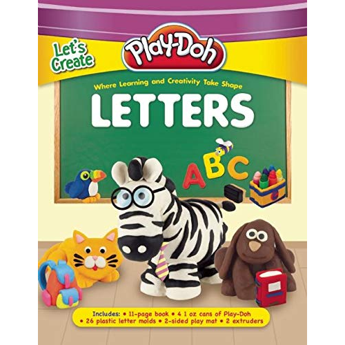 Includes: 11 page book, 6 (1 oz) cans of play doh, 26 plastic letter molds, 2 sided play mat, 2 extruders