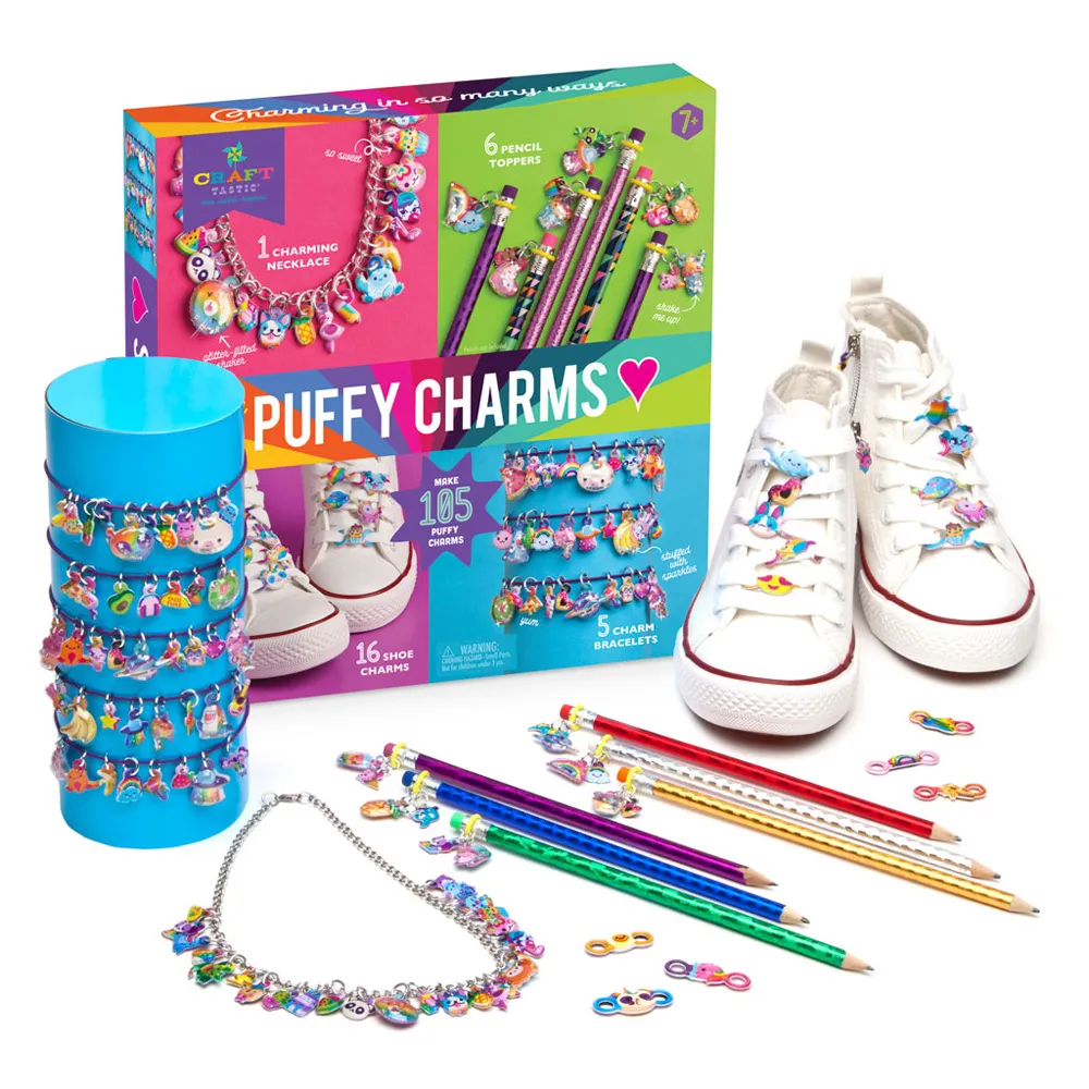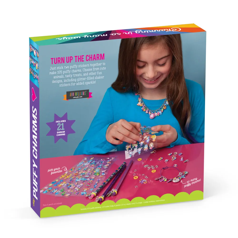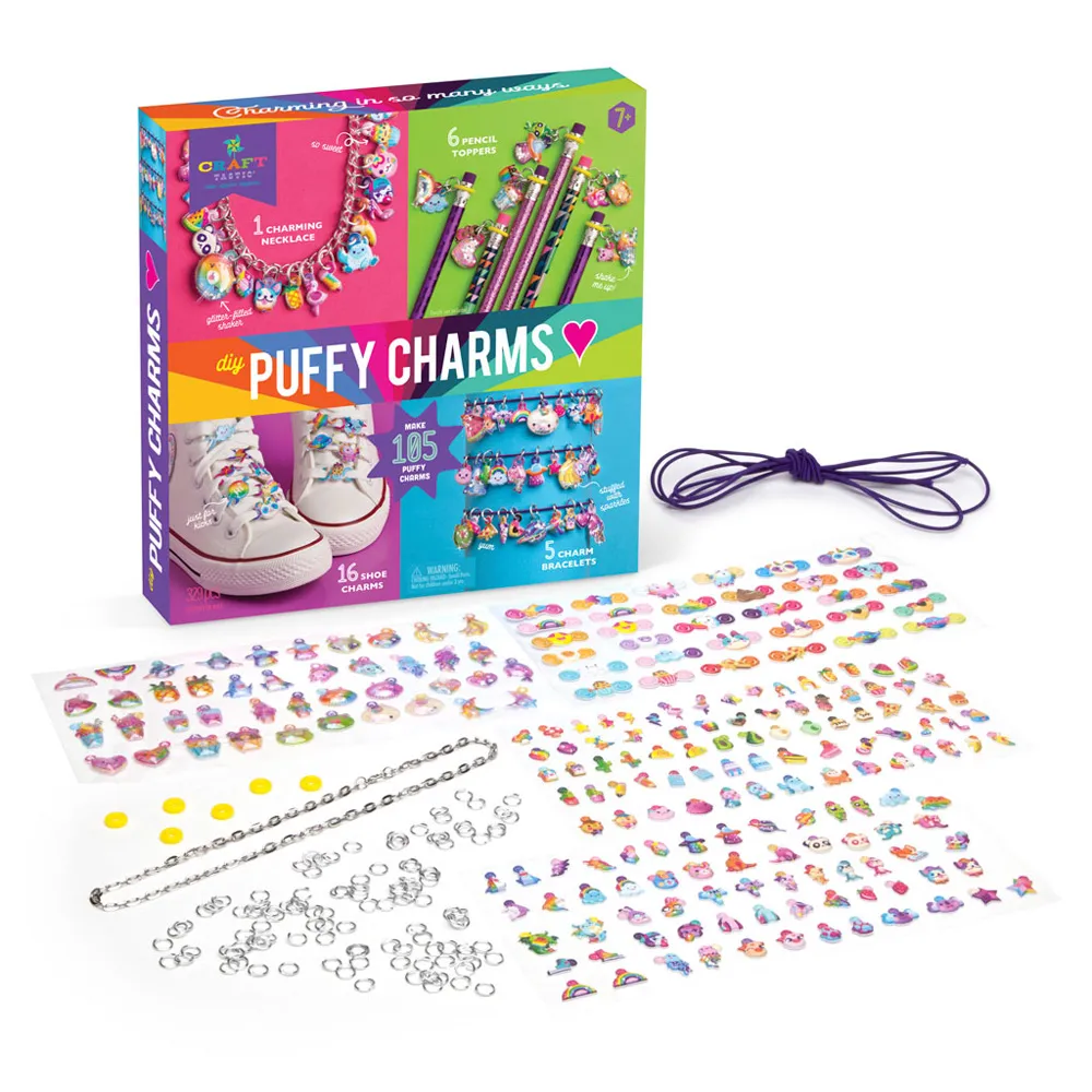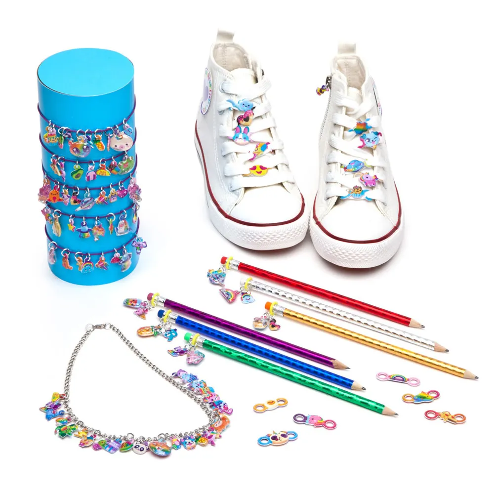 From pineapples to pandas, from pizza to planets, the amount of charm packed into this set is spectacular! It’s easy and fun to make-simply stick two puffy stickers together to make a charm and add it to a necklace, pencil, shoe or bracelet or a look all your own. There are even 21 glitter-filled shaker charms for added sparkle!