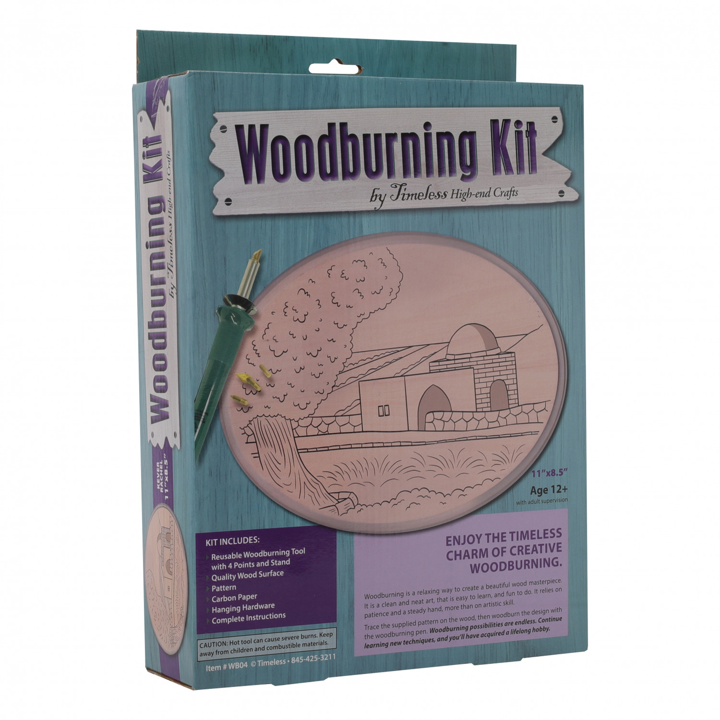 Includes: reusable woodburning tool with 4 points and stand, quality wood surface, pattern, carbon paper, hanging hardware and complete instructions